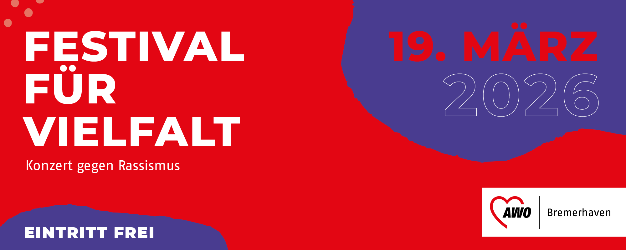 Anlässlich des Welttages gegen Rassismus veranstaltet die AWO Bremerhaven wieder das FESTIVAL FÜR VIELFALT. Der Termin steht bereits fest: Donnerstag, 19. März, 19 Uhr, Theater im Fischereihafen/Bremerhaven.