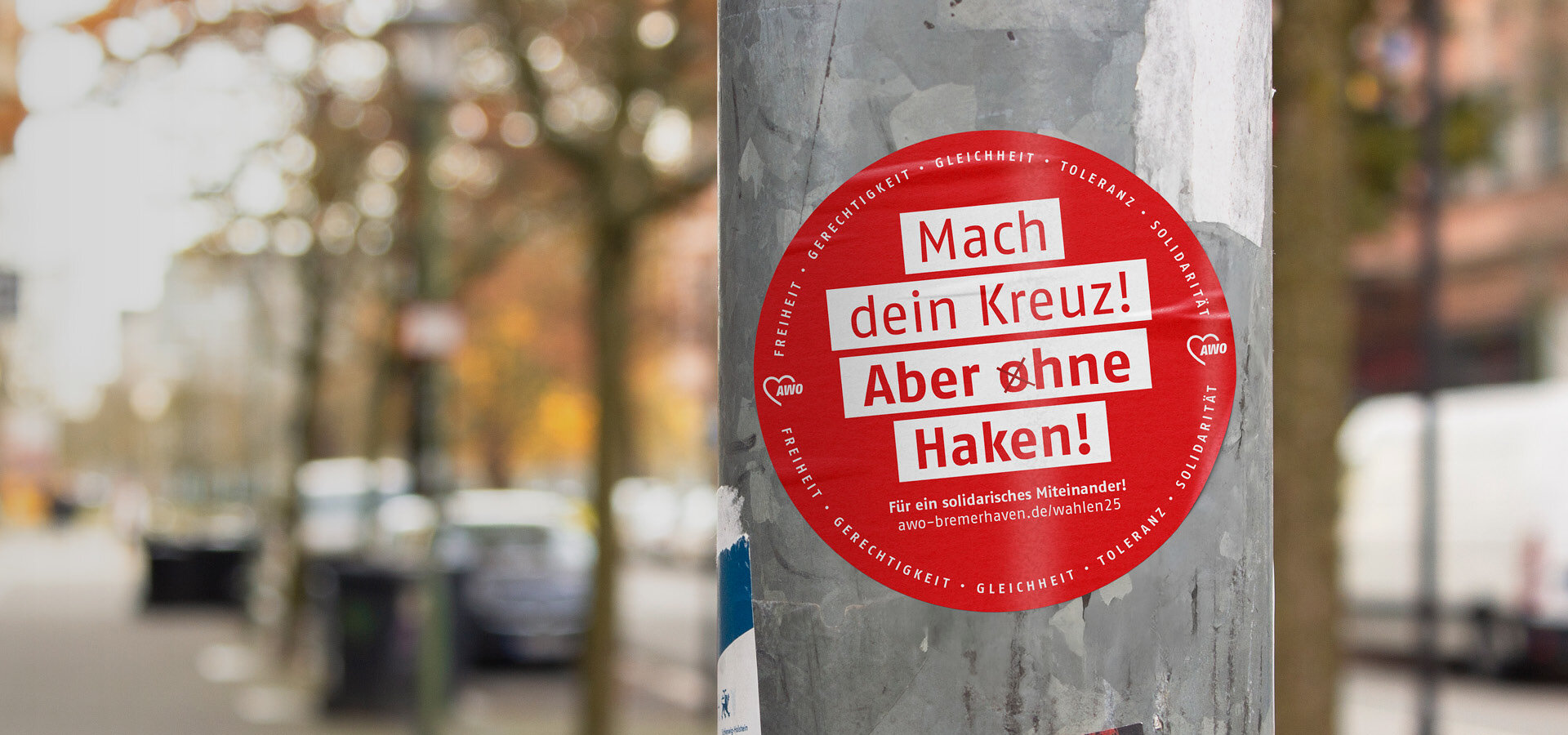 Mit dem Slogan „Mach Dein Kreuz! Aber ohne Haken!” ruft die AWO Bremerhaven alle Wahlberechtigten in Bremerhaven und umzu auf, bei der Bundestagswahl am 23. Februar ihre Stimme den Parteien zu geben, die in unseren krisenbehafteten Zeiten für einen starken Sozialstaat, eine lebendige Zivilgesellschaft und eine robuste Demokratie einstehen. Jede Stimme ist wichtig, um die Demokratie zu stärken und den gesellschaftlichen Zusammenhalt zu festigen. Deshalb: Seid dabei, motiviert andere, ihre Stimme bei der Wahl abzugeben, sich einzubringen und mit ihrer Wahl aktiv etwas zu bewegen.